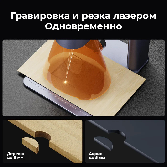 • Сочетание 10Вт синего диода и 2Вт инфракрасного лазера открывает возможности для работы с более чем 300 материалами.