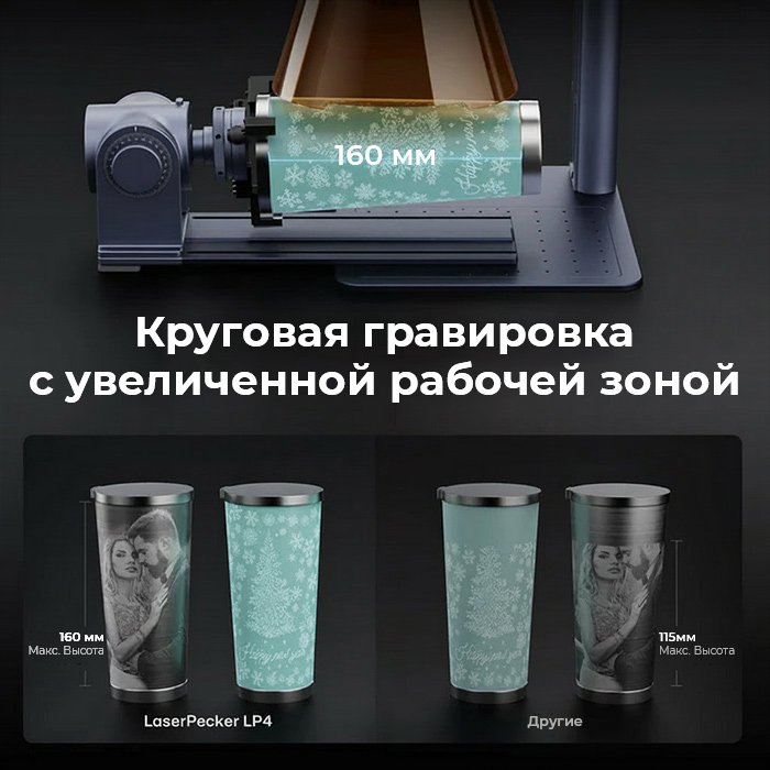 Поворотный модуль LaserPecker Rotary Extension — аксессуар для точной лазерной гравировки по кольцам, бутылкам, кружкам, ручкам и другим цилиндрическим предметам.  Совместим с моделями LP2 Plus, LP4, LP5, LX2. Обеспечивает плавное вращение, высокую точность (0,014°) и надёжную фиксацию без повреждений.  Установка за минуту — plug & play. Идеально для персонализации ювелирки, посуды и сувениров.  Расширьте возможности вашего LaserPecker уже сегодня!