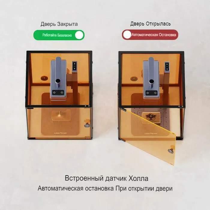 Конструкция защитного бокса LaserPecker продумана до мелочей. Благодаря датчику Холла лазер мгновенно отключается при открытии дверцы. Кроме того, прозрачные стенки обеспечивают круговой обзор 360°. Поэтому вы легко контролируете каждый этап гравировки. В результате, процесс становится не только безопасным, но и наглядным. К тому же, это значительно повышает точность работы.